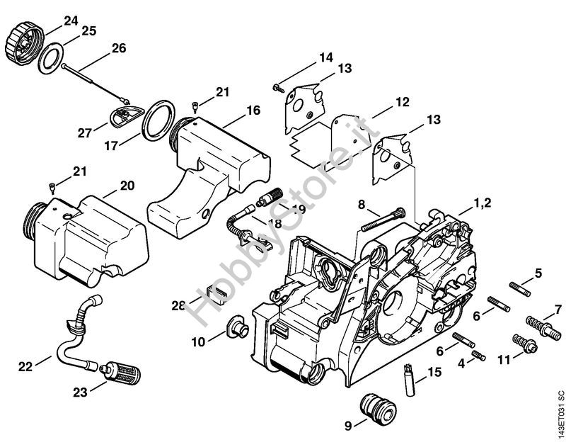 Ricambio Carcassa motore Motoseghe a benzina (MS) 018 STIHL Contiene anche i ricambi nr. da 4 a 8, 12 a 15