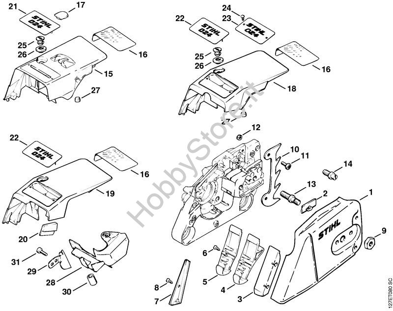 Ricambio Cappottatura Motoseghe a benzina (MS) 024 SW STIHL Contiene anche i ricambi n. 16 e 17