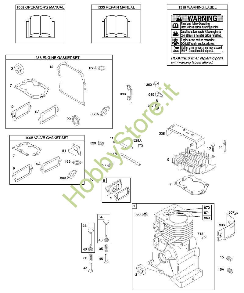 - D - Albero a camme, cilindro, testata, set guarnizioni, manuale per l'uso, manuale riparazioni, etichetta di avvertenza 091212-1356-E1