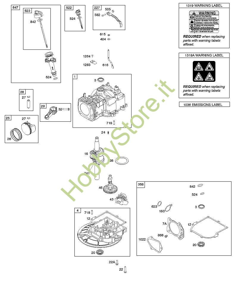 - D - Albero a camme, albero motore, cilindro, set guarnizione, pistone/segmento pistone/biella, coppa ed etichetta indicazione di pericolo 093J02-0062-H1