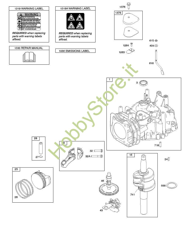 C - Albero a camme, albero motore, cilindro, manuale per l'uso, biella/anelli/pistone, etichetta di avvertenza B&S - 12 seriale da 122Q02-0169-B1 brand Stihl