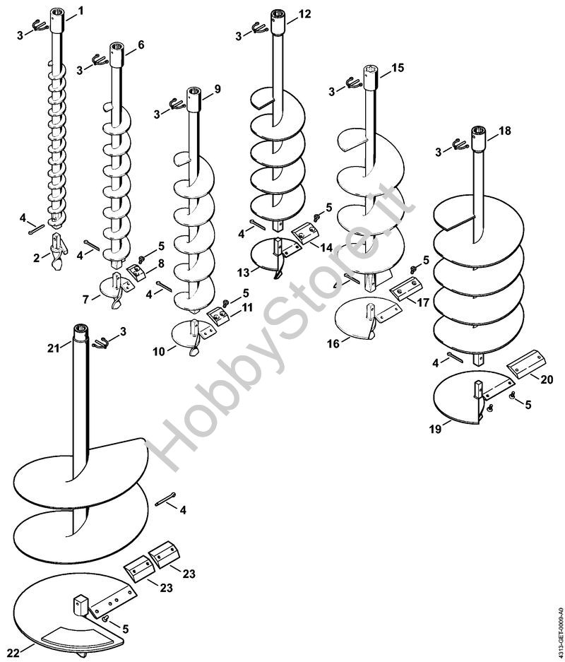 Ricambio originale Trivella diam. 40 mm BT 131 BT 131 Stihl Contiene anche i ricambi da nr. 2 a 4