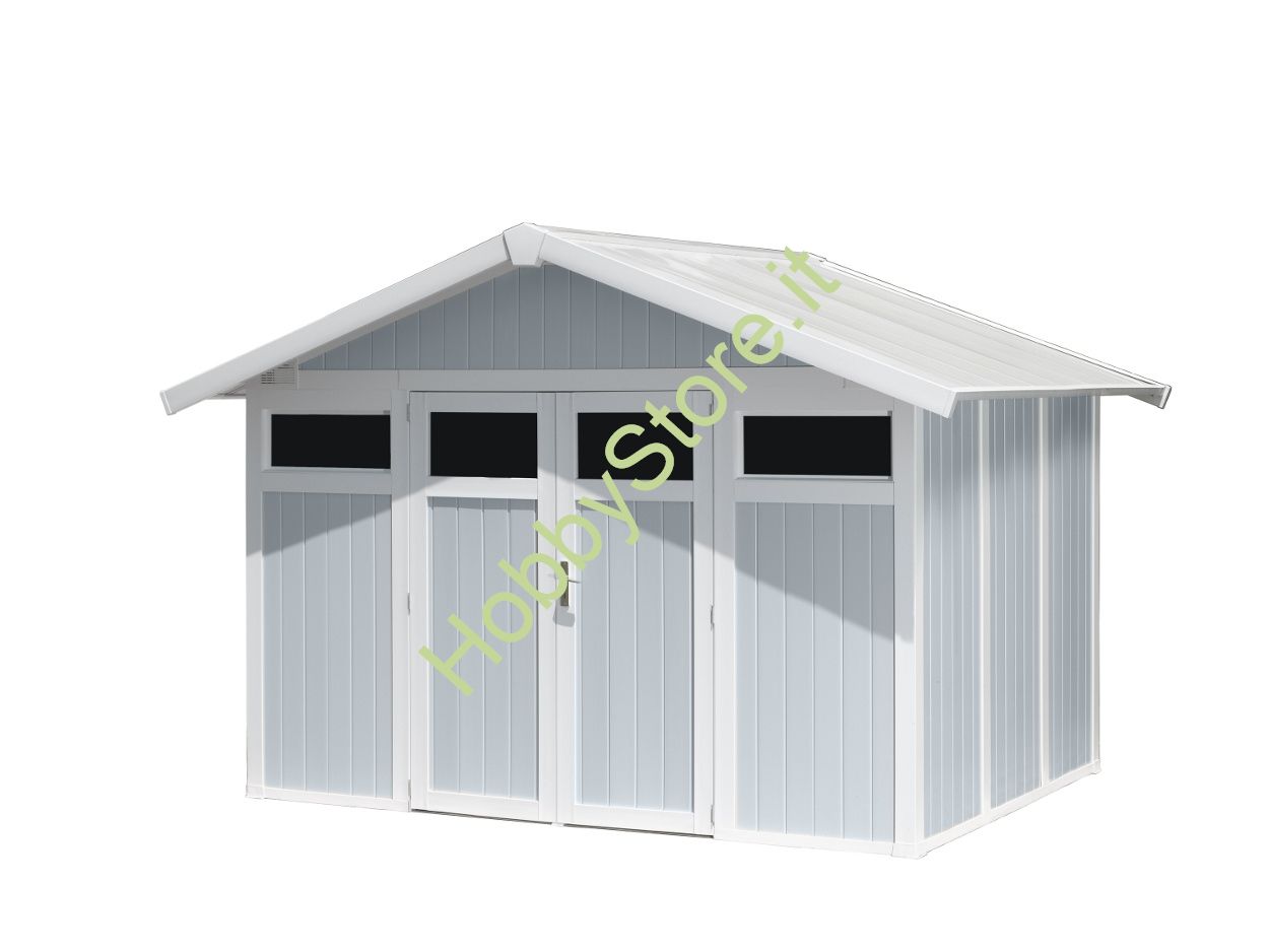 Tettoia laterale in PVC (2,64 mq) Altezza tettoia 1,41 cm x larghezza 2,22 cm x profondità 1,19 cm. Tettoia color grigio chiaro, pali bianchi. Solo per casette Grosfillex da 7 mq e 11 mq.