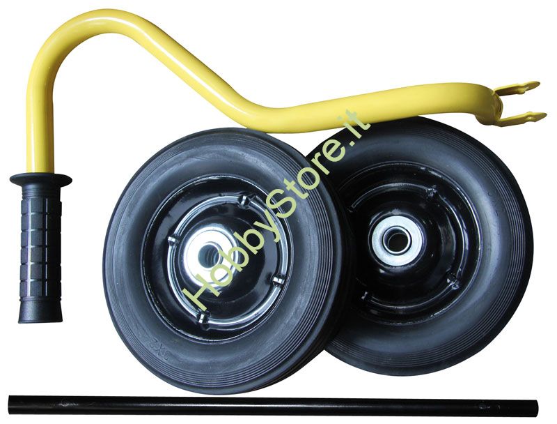 Con alcune semplici operazioni si esegue il montaggio del kit ruote che comprende 2 ruote 1 barra di collegamento1 manico ripiegabile per essere impugnato e spostato.