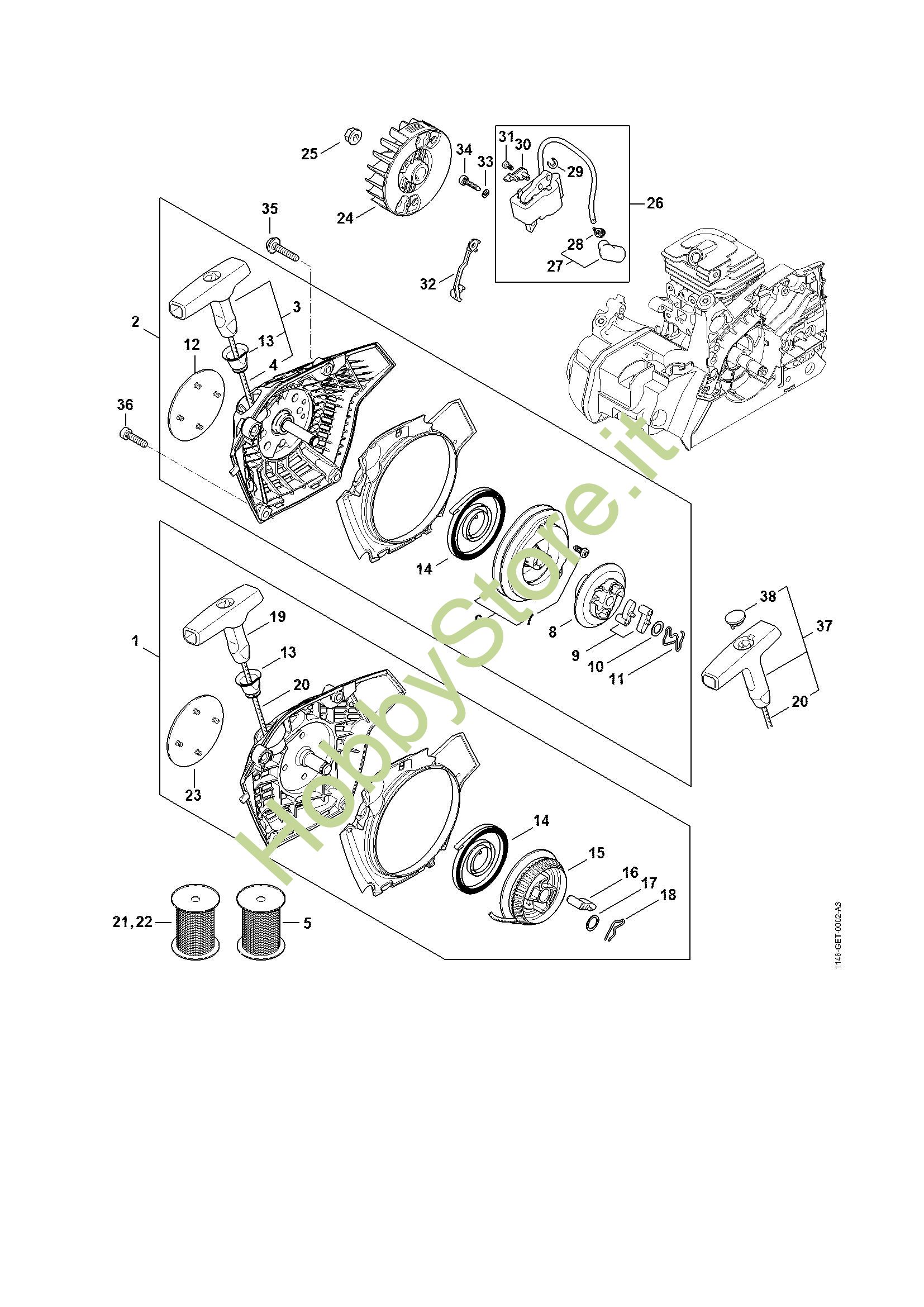 Ricambio Carenatura ventola con dispositivo di avviamento Motoseghe a benzina (MS) MS 172 STIHL Contiene anche i ricambi nr. da 13 a 20 e 23