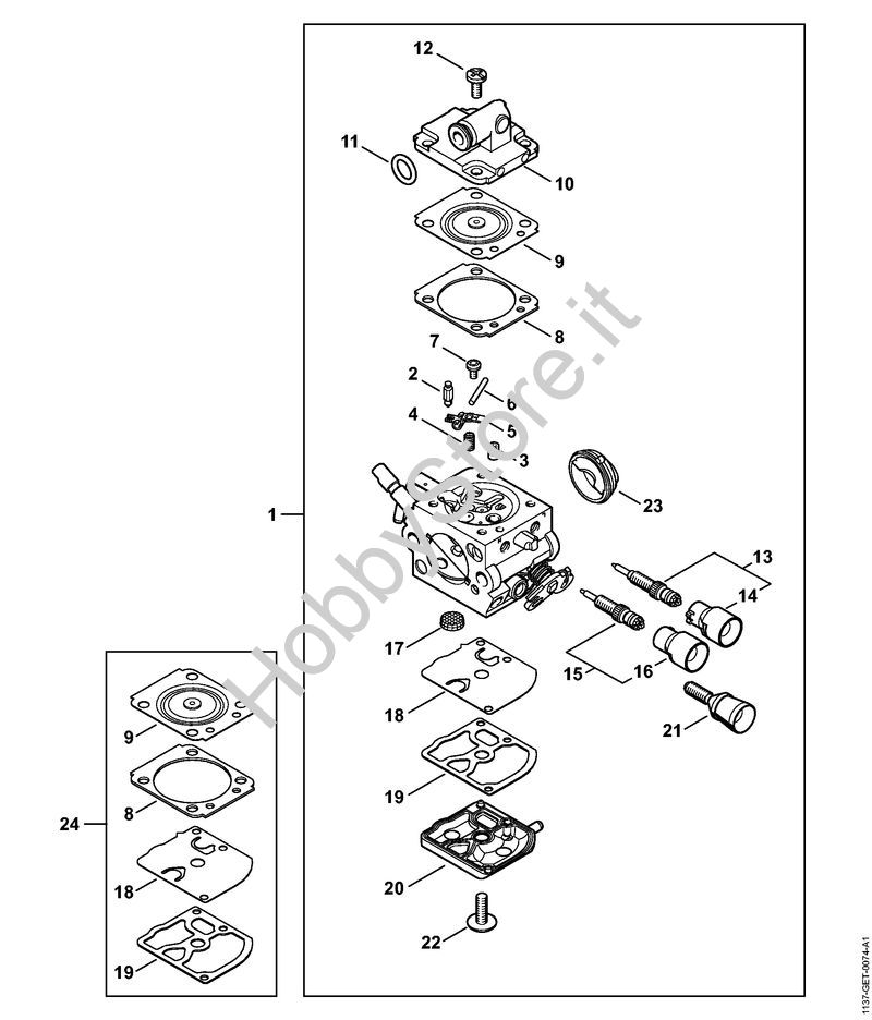 Ricambio Carburatore 1137/20 Motoseghe a benzina (MS) MS 193 C-E STIHL Contiene anche i ricambi da n. 2 a 23