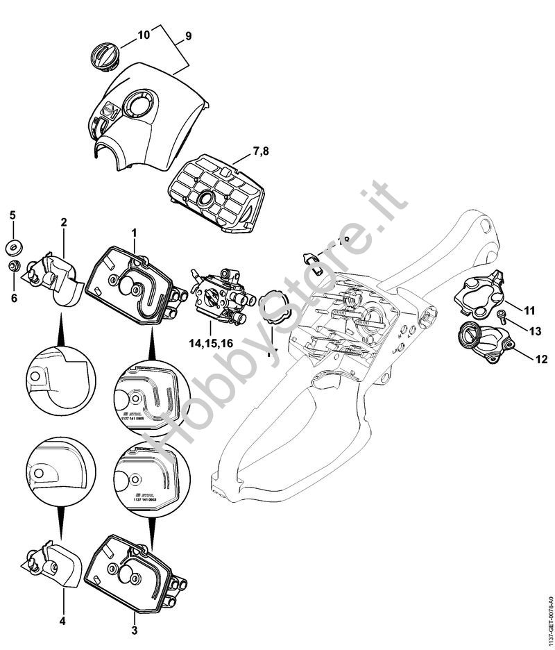 Ricambio Coperchio sede carburatore Motoseghe a benzina (MS) MS 193 C-E STIHL Contiene anche i ricambi n. 10