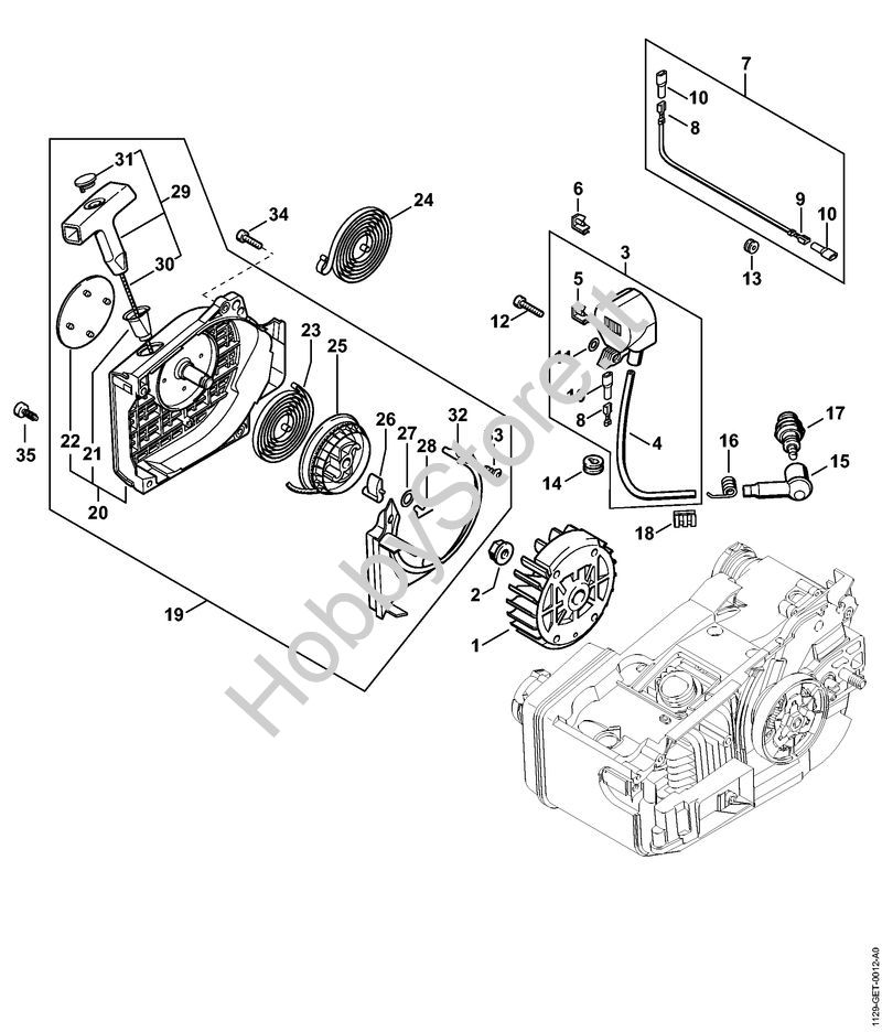 Ricambio Carenatura ventola con dispositivo di avviamento Motoseghe a benzina (MS) MS 200 T STIHL Contiene anche i ricambi nr. da 20 a 23, 25 a 33