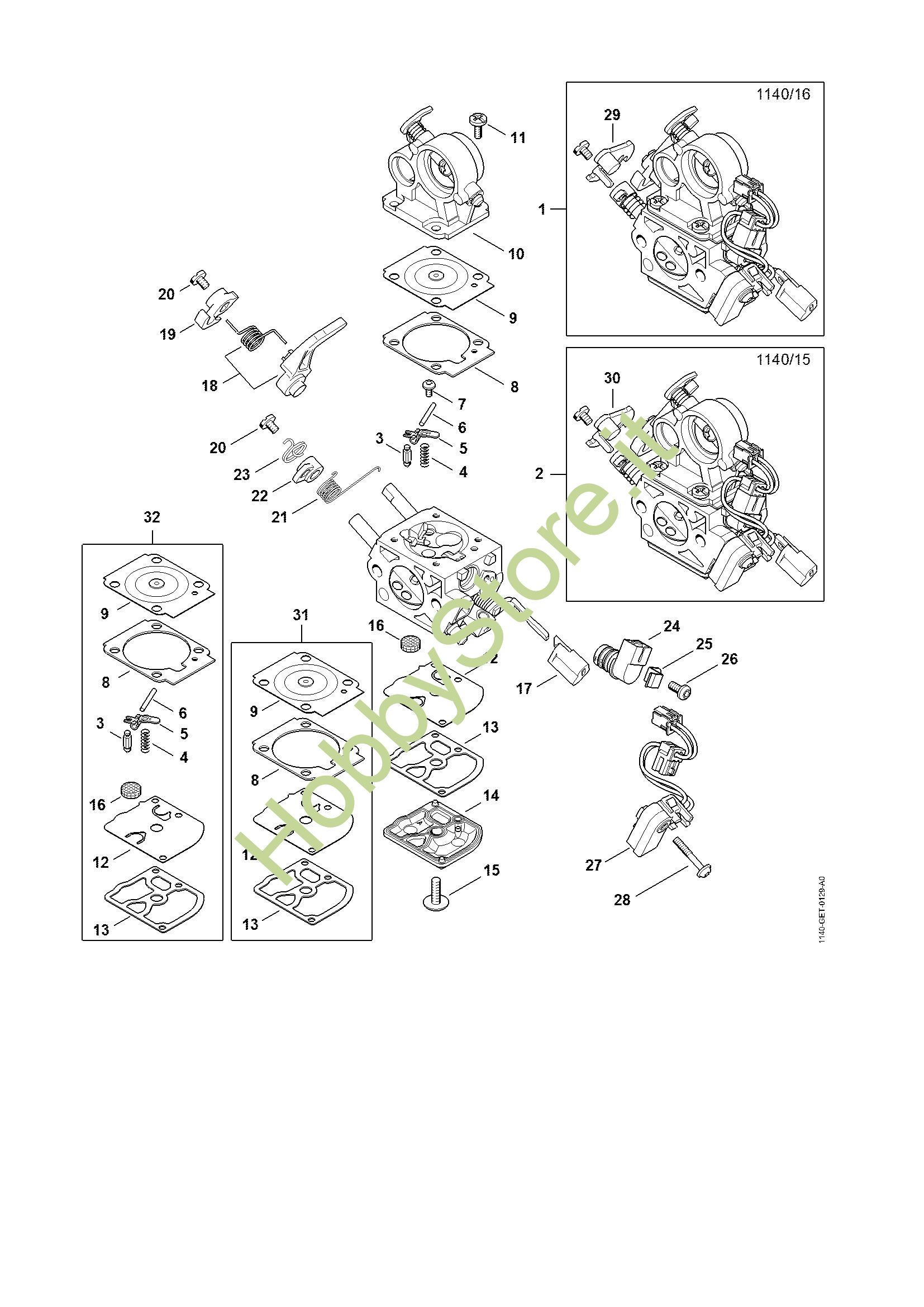 Ricambio Carburatore 1140/15 Motoseghe a benzina (MS) MS 362 C-M VW STIHL Contiene anche i ricambi nr. da 3 a 28 e 30