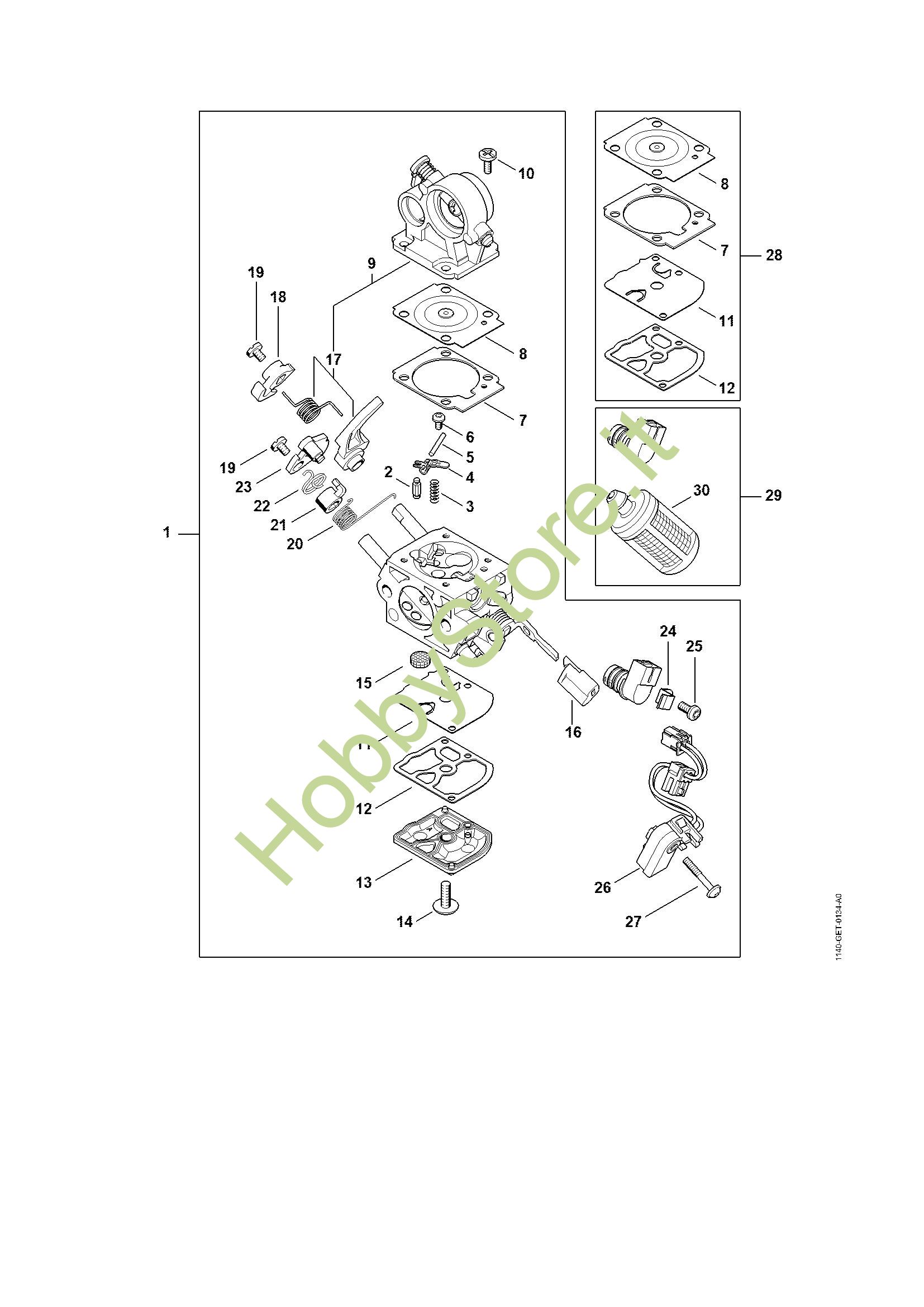 Ricambio Carburatore C1Q-100357D Motoseghe a benzina (MS) MS 362 C-M VW STIHL Contiene anche i ricambi da n. 2 a 27