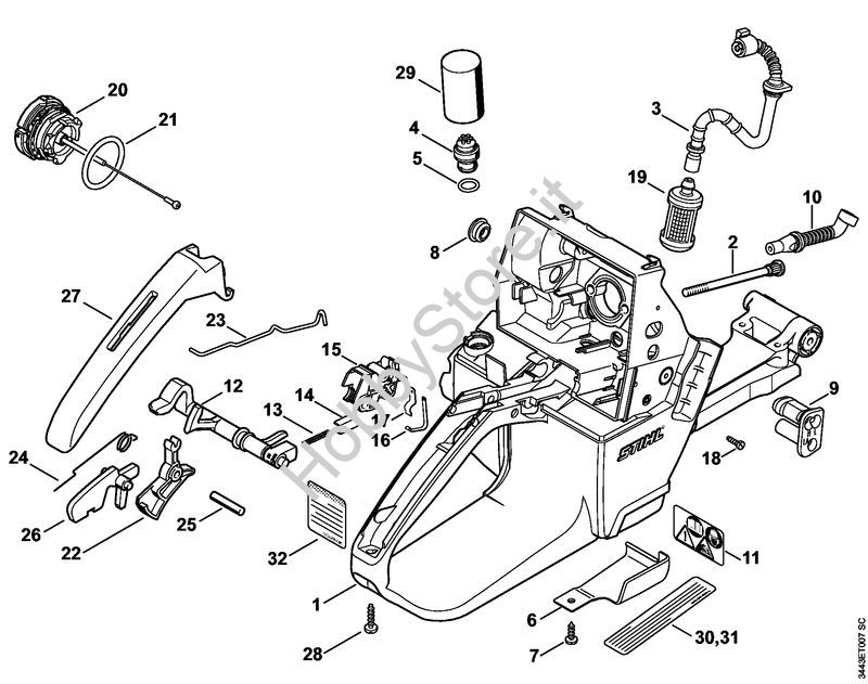 Ricambio Corpo serbatoio Motoseghe a benzina (MS) MS 461-VW STIHL Contiene anche i ricambi nr. da 2 a 9, 20, 21