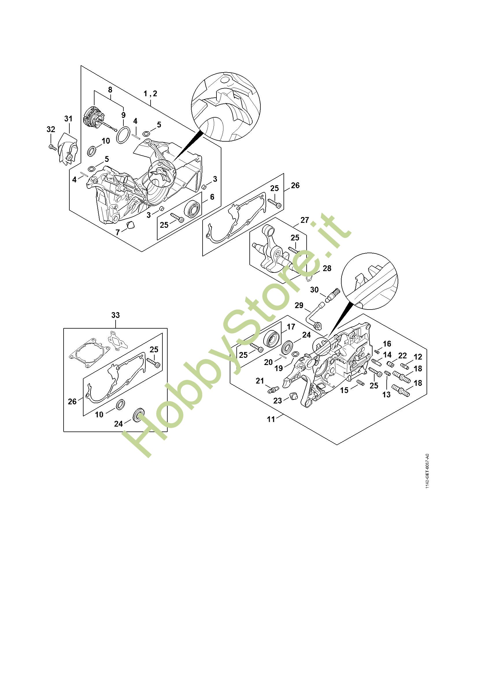 Ricambio Semi-carter albero a gomito Motoseghe a benzina (MS) MS 462 C-M VW STIHL Contiene anche i ricambi da n. 12 a 25
