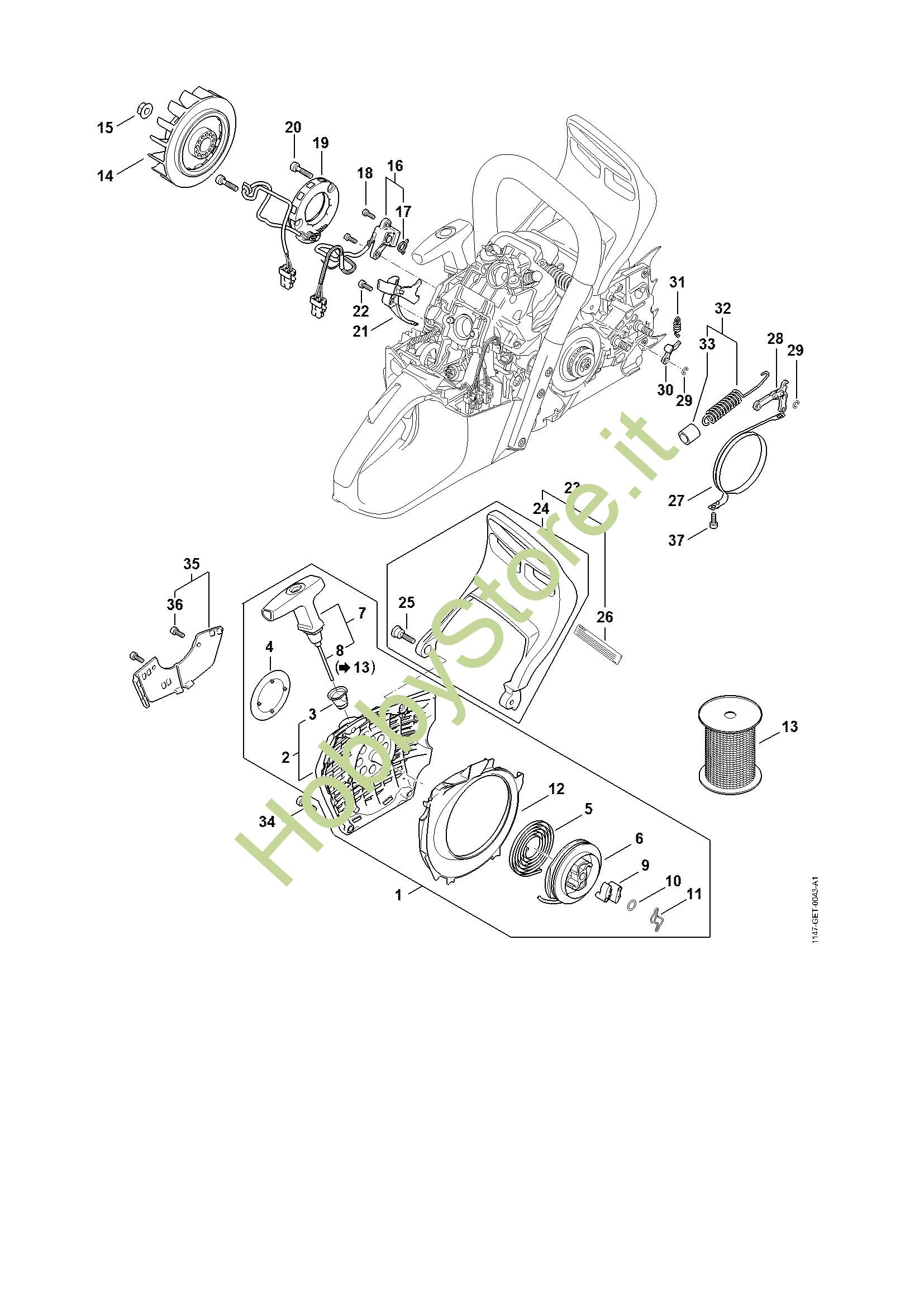 Ricambio Carenatura ventola con dispositivo di avviamento Motoseghe a benzina (MS) MS 500i STIHL Contiene anche i ricambi da n. 2 a 12