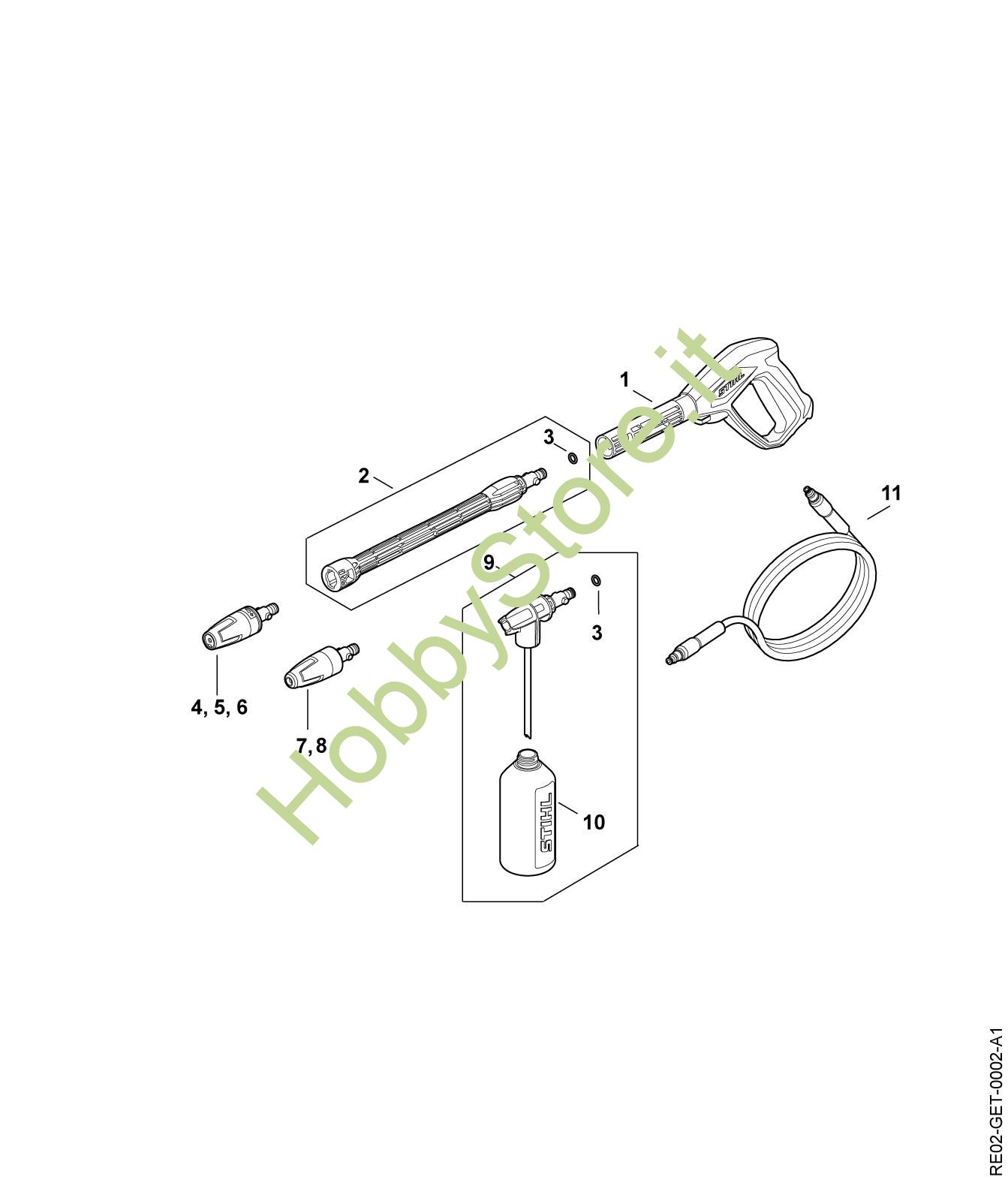 Ricambio Gruppo spruzzatore Idropulitrice elettrica (RE) RE 80.0 X STIHL Contiene anche i ricambi n. 3 e 10