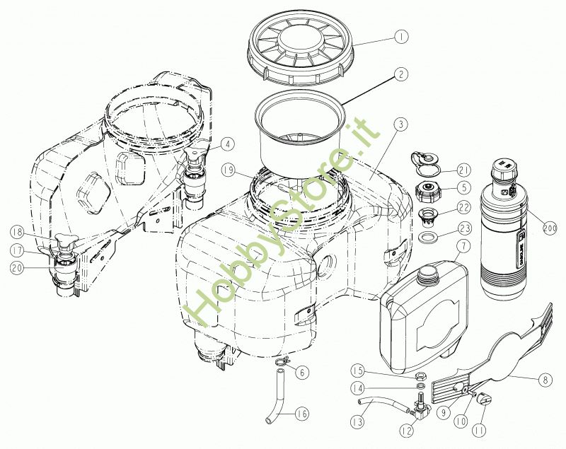 Ricambio 999 Serb.liquidi L.17 PS/PSR con att. cpl Serbatoio liquidi L.17 e miscela x carb. vaschetta prodotto dal 01/01/2010 L3V della marca CIFARELLI Contiene anche i ricambi dal al4, 6, 17 al 20