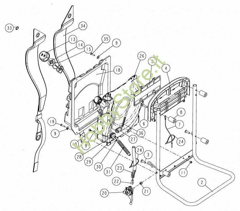 Ricambio 20 Leva gas + stop atom, soffiatore cpl Telaio, serbatoio, schienale prodotto dal 25/09/2007 della marca CIFARELLI Contiene anche i ricambi 20, 21 Solo per modelli BL3A/1-/4-/5 - Only