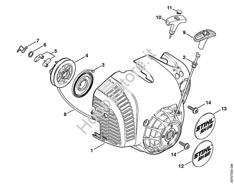 Ricambio Carenatura ventola con dispositivo di avviamento Trituratori ad aspirazione (SH) SH 56 STIHL Contiene anche i ricambi nr. da 1 a 8, 10, 11