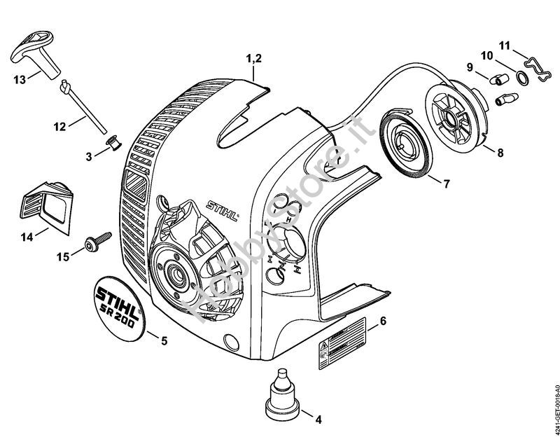 Ricambio Carenatura ventola con dispositivo di avviamento Atomizzatori (SR) SR 200-D STIHL Contiene anche i ricambi nr. 1, 3 a 5, 7 a 13