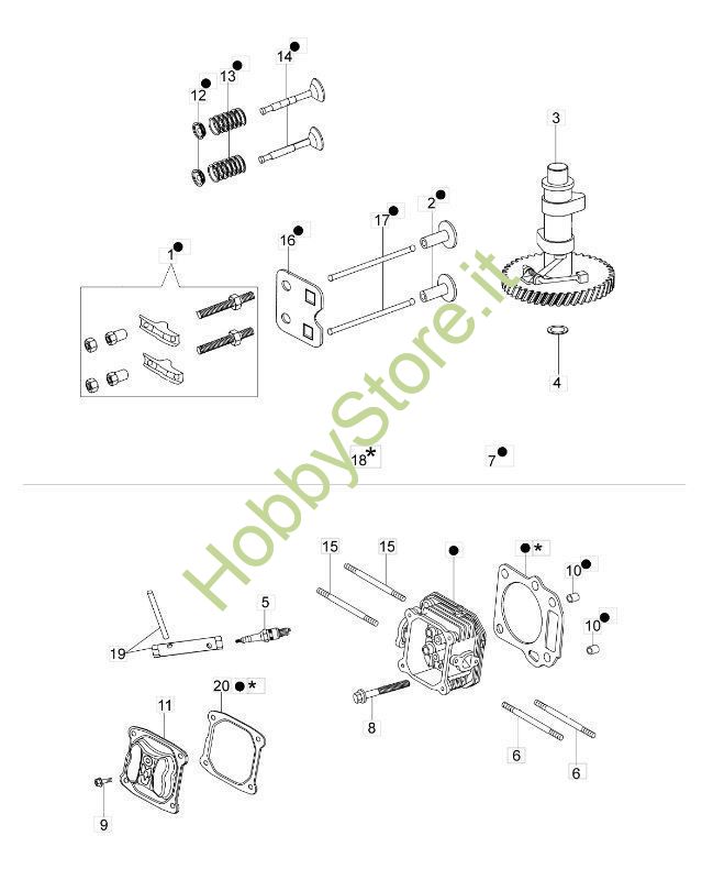 Ricambi relativi alla testa e alle valvole di un motore di un tosaerba G 48 TK Comfort Plus Oleomac a trazione.