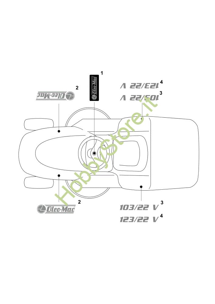 Ricambio Etichetta Model: 103/22 V Etichette (2/2) OM 123/22 V Cat. 2021 Trattorino della marca Oleo-Mac Richiede pezzi:2