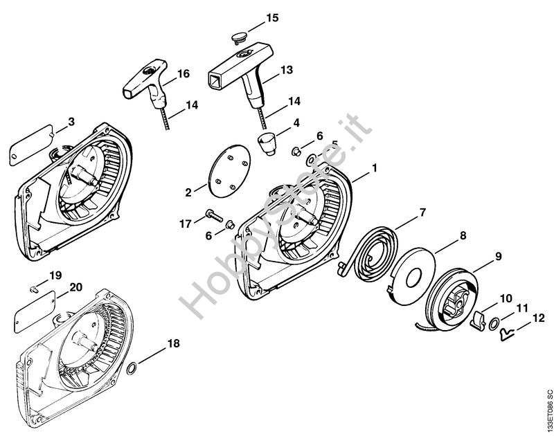 Ricambio Carenatura ventola con dispositivo di avviamento Motoseghe a benzina (MS) 026 W STIHL Contiene anche i ricambi nr. 1, 2, 4 a 15