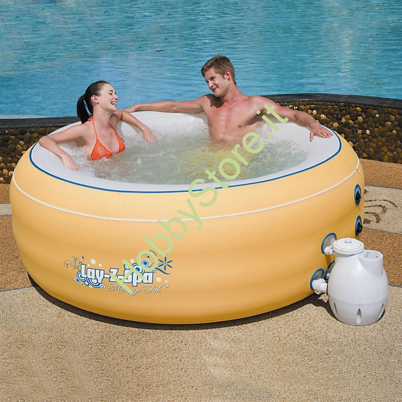 Altre funzionalità e caratteristiche includono: Sistema Lay-Z-Massage con effetto bolle, che produce oltre 100 micro-getti d'aria Sistema di filtraggio dell'acqua con cartucce sostituibili Cuscini gonfiabili Copertura in nylon con zip Nessun utensile necessario – richiede solo 15 minuti per l'installazione DVD con istruzioni per il montaggio e la manutenzione incluso
