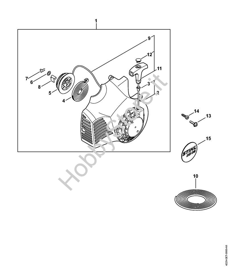Ricambio Carenatura ventola con dispositivo di avviamento Soffiatori (BG, BR) BG 85 STIHL Contiene anche i ricambi nr. da 2 a 9, 11, 12