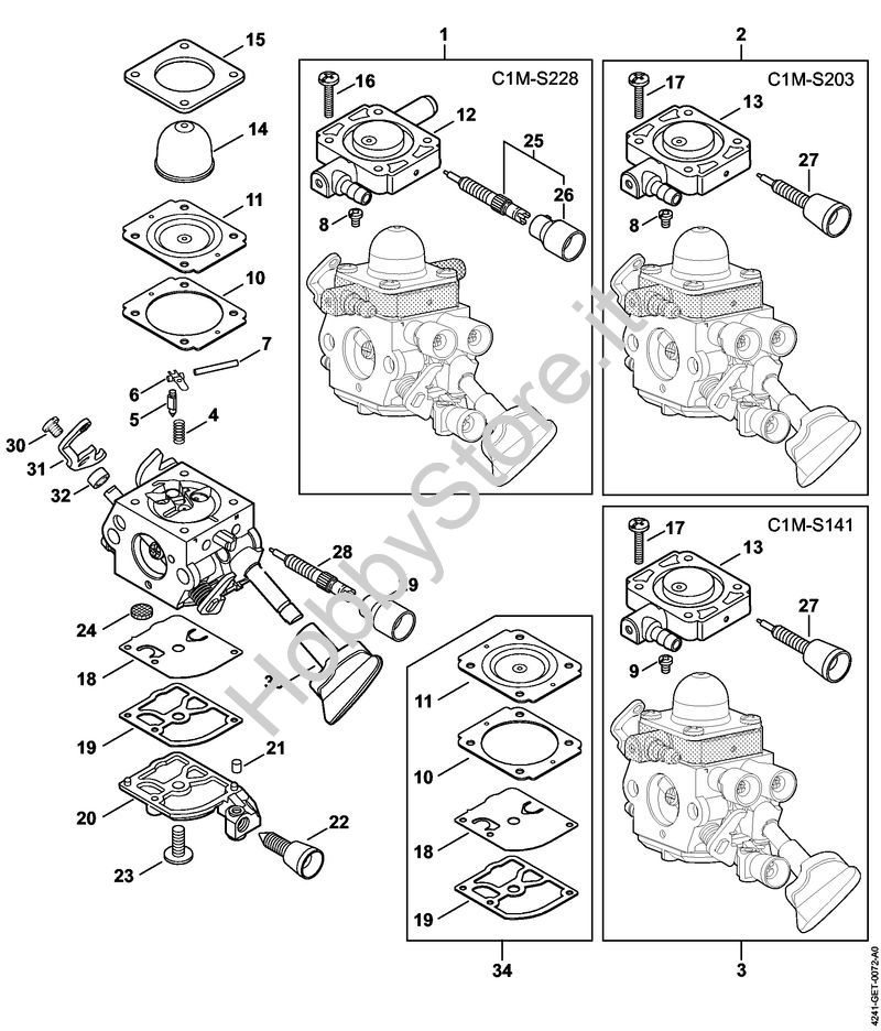 Ricambio Carburatore C1M-S203A Soffiatori (BG, BR) BG 86 STIHL Contiene anche i ricambi nr. da 4 a 8, 10, 11, 13 a 15, 17 a 24, 27 a 33