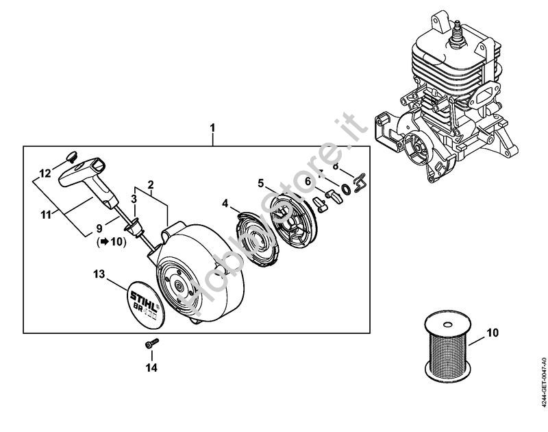Ricambio Coperchio avviamento con dispositivo di avviamento Soffiatori (BG, BR) BR 450 STIHL Contiene anche i ricambi nr. da 2 a 9, 11 a 13
