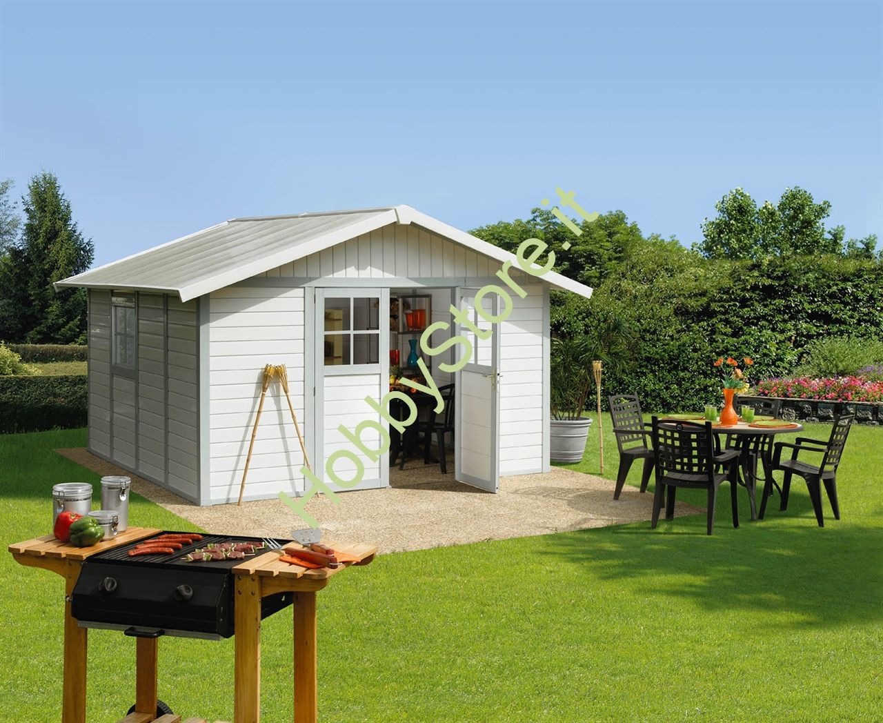 Tettoia laterale in PVC (2,64 mq) Altezza tettoia 1,41 cm x larghezza 2,22 cm x profondità 1,19 cm. Tettoia color grigio chiaro, pali bianchi. Solo per casette Grosfillex da 7 mq e 11 mq.