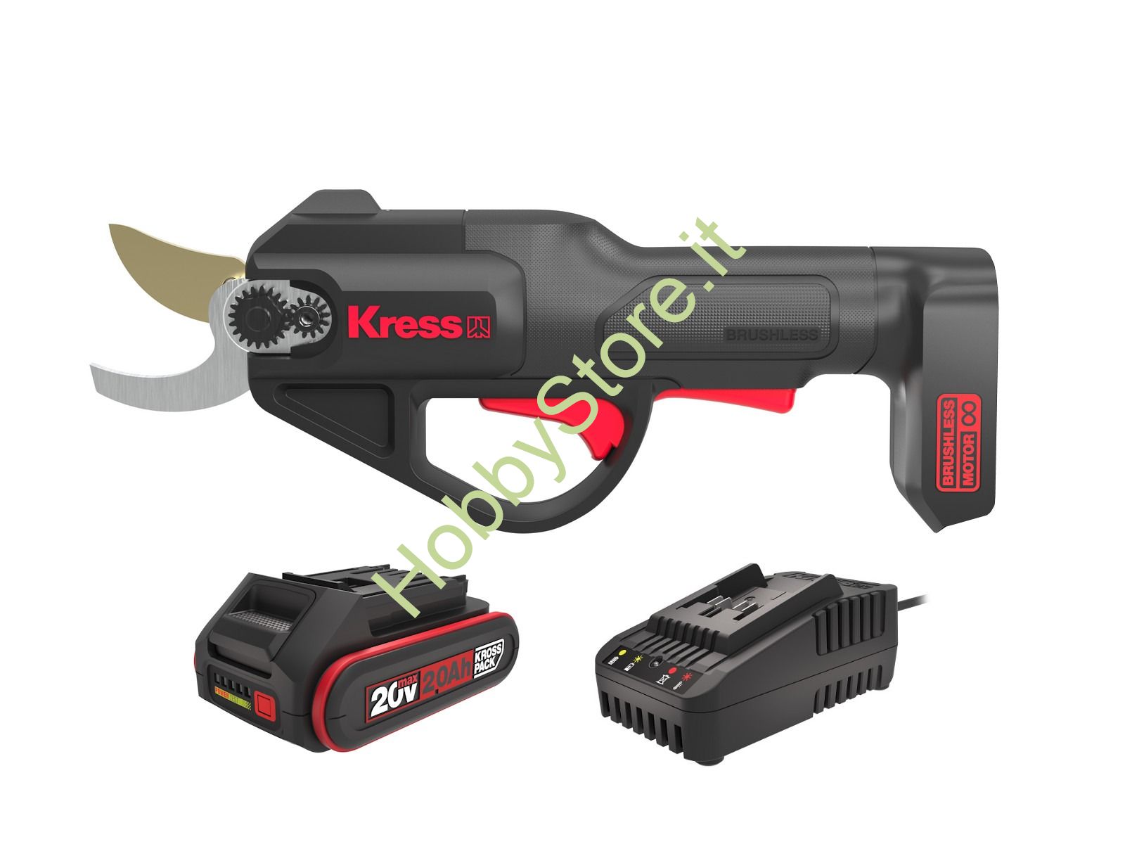 Seghetto Kress completo di due batterie 20 Volt 2 A e caricabatterie a 20 Volt. Dotato di motore BrushLess, pompa di olio AUTOMATICA, lunghezza lama 12 cm. Durata 125 minuti (taglio legno di pino di 5 cm).