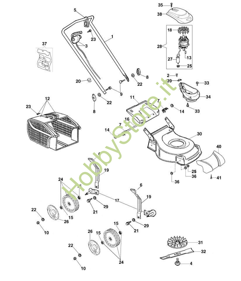 Schema completo dei ricambi di un tosaerba elettrico G 44 PE Oleomac. In caso di acquisto di ricambi, indicare nel campo note l'anno di acquisto del rasaerba G44PE in modo da identificare i ricambi corretti.