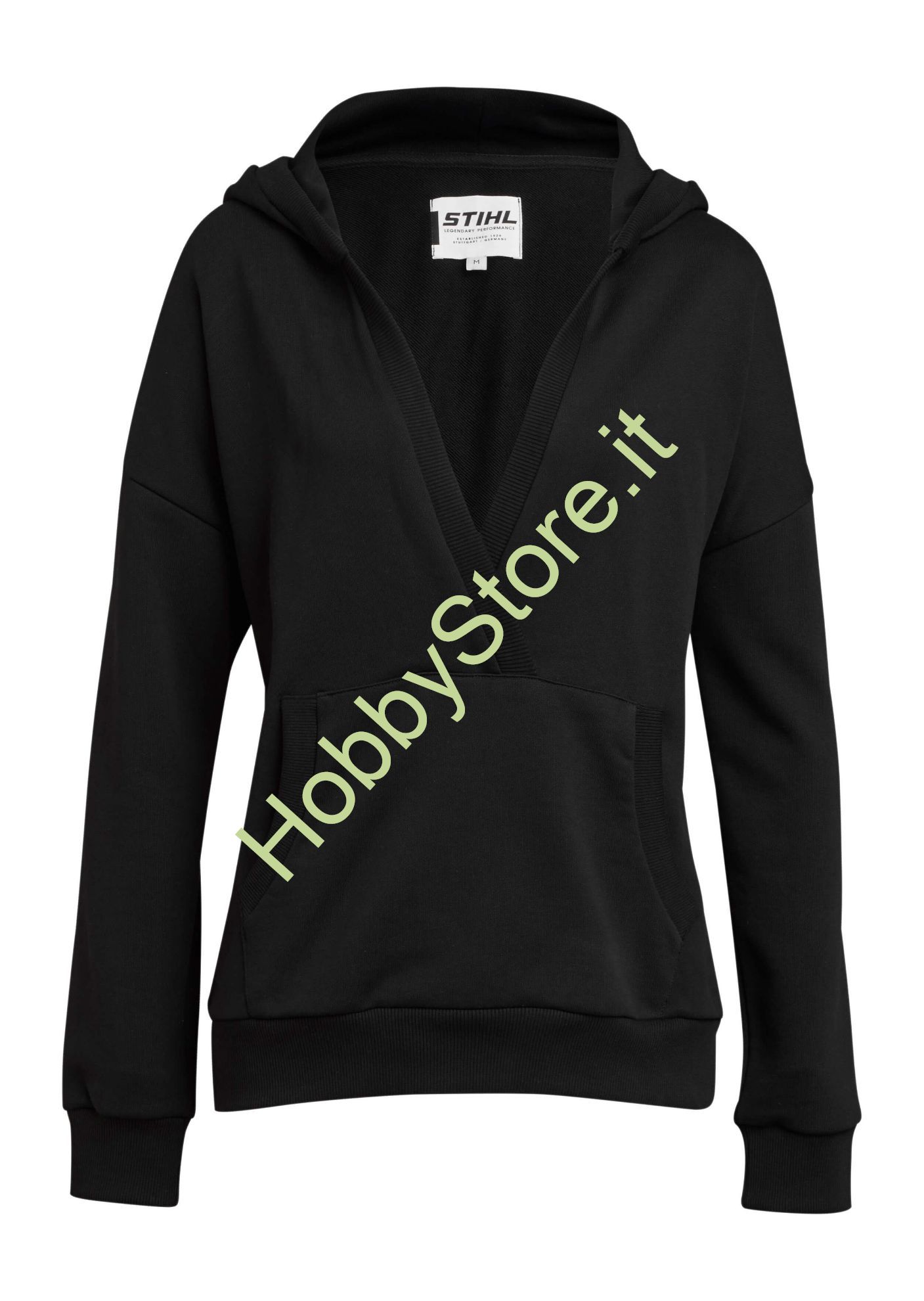 Felpa dal taglio stretto e soffice con logo STIHL argentato riflettente sul retro, spalle scese e ampia scollatura sovrapposta. Per un effetto davvero spettacolare! La tasca a marsupio scongiura il rischio “mani gelate”.