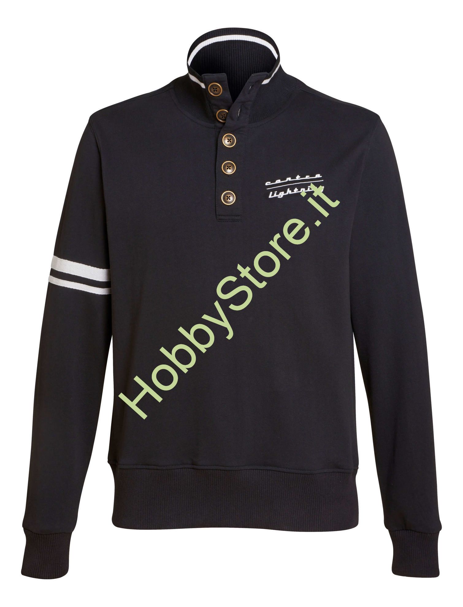 Felpa in cotone French Terry, in stile Troyer come da migliore tradizione dei college americani. Caratteristiche: Colletto montante, lunga abbottonatura, bordi a costine e dettaglio a righe sul braccio destro.