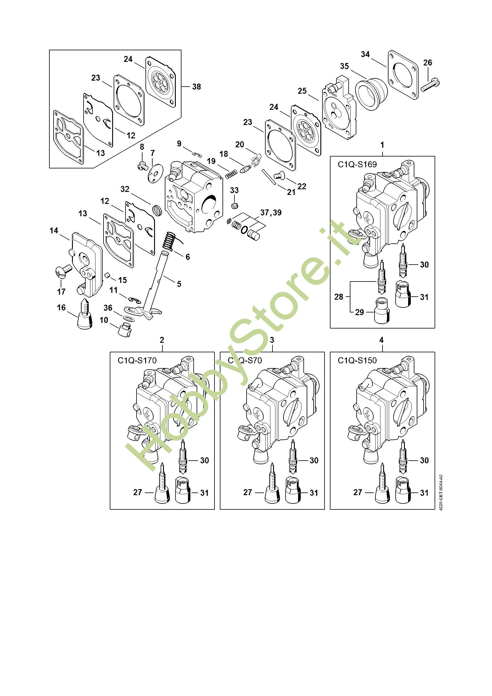 Ricambio Carburatore C1Q-S169E Tagliasiepi (HS) HS 45 STIHL Contiene anche i ricambi nr. da 5 a 26, 28 a 37