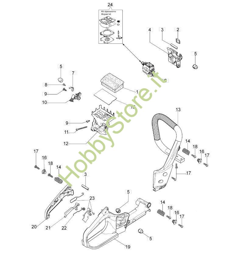 Tavola tecnica dell'impugnatura e del filtro d'aria per motosega GS 350 C della Oleomak