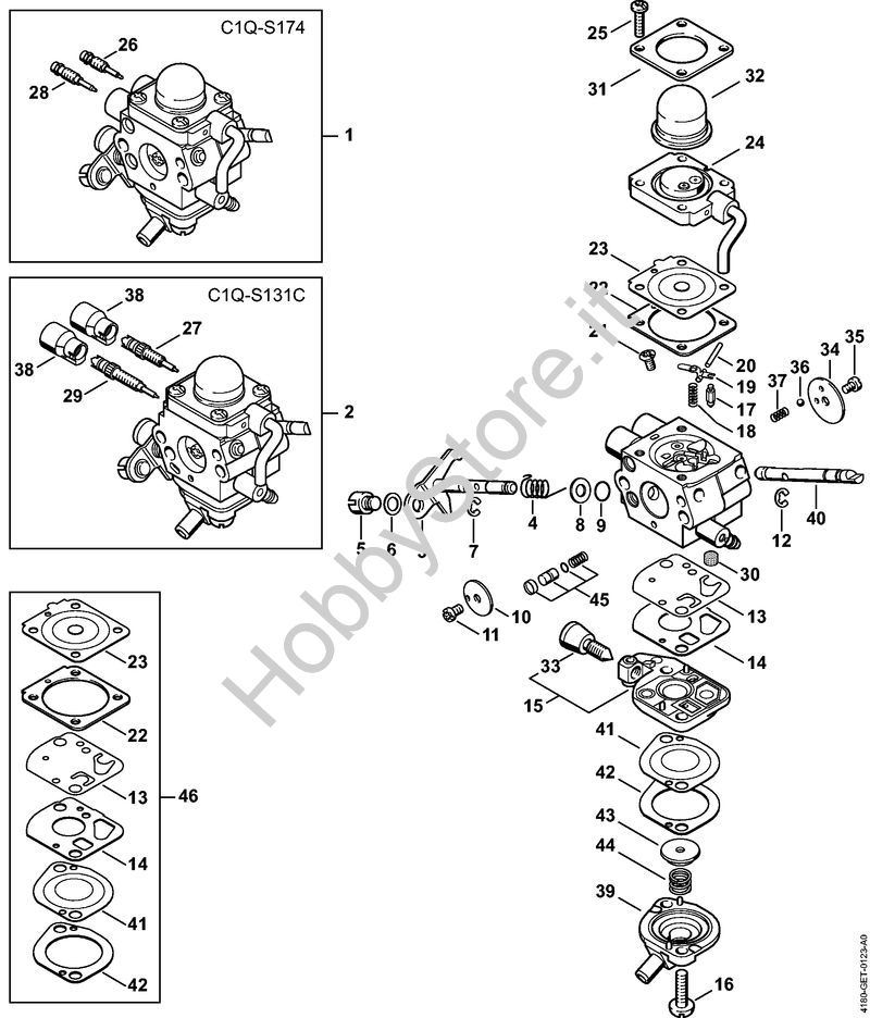 Ricambio Carburatore C1Q-S174A Motori Kombi (KM) KM 90 STIHL Contiene anche i ricambi nr. da 3 a 26, 28, 30 a 37, 39 a 45