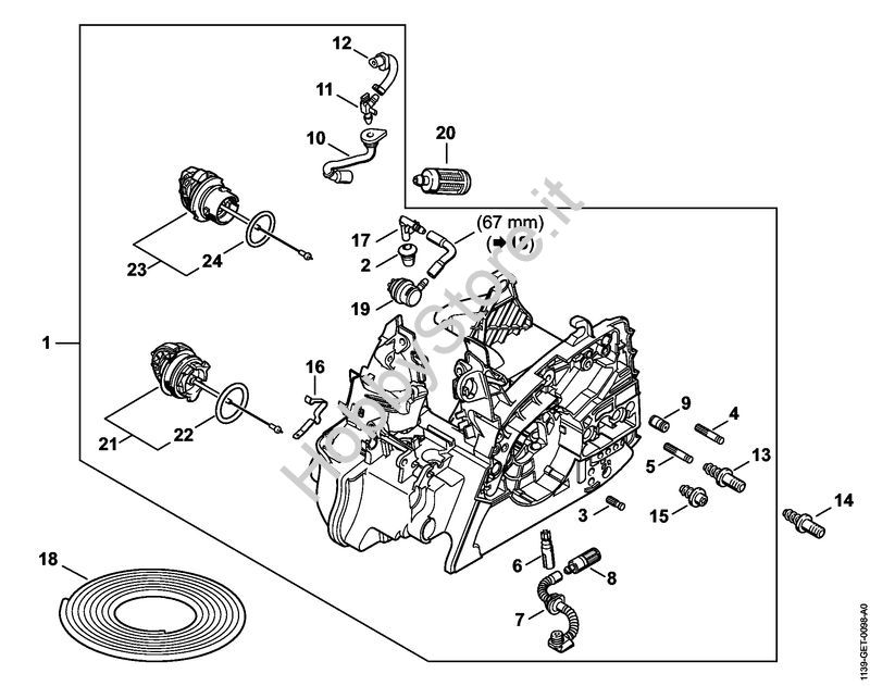 Ricambio Carcassa motore Motoseghe a benzina (MS) MS 171 STIHL Contiene anche i ricambi nr. da 2 a 13, 15 a 17, 19, 21 a 24