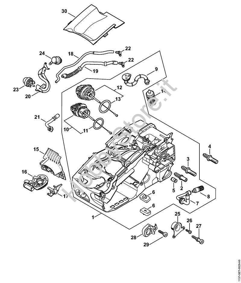 Ricambio Carcassa motore Motoseghe a benzina (MS) MS 194 C-E STIHL Contiene anche i ricambi nr. 2, 3, 5 a 13