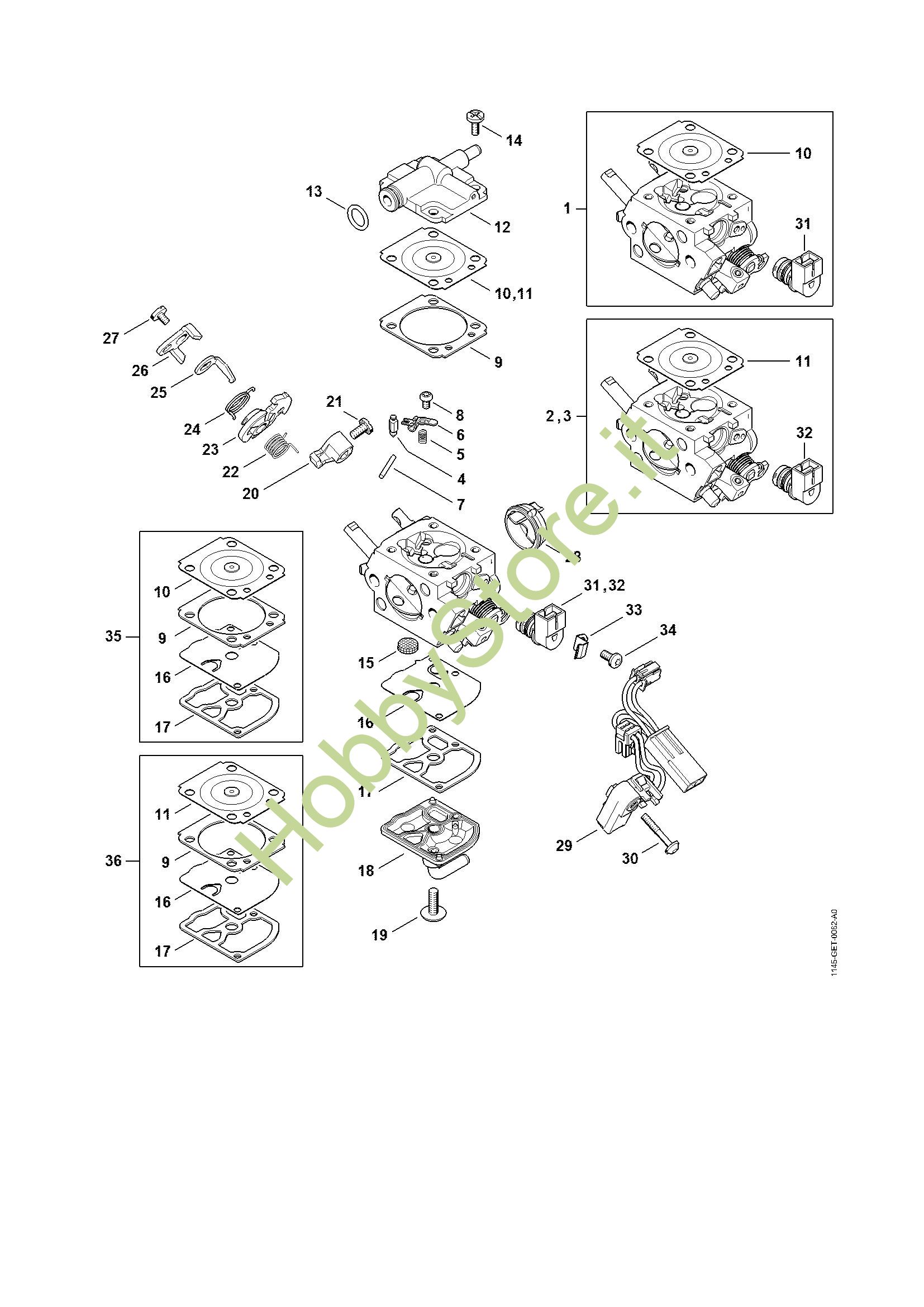 Ricambio Carburatore 1145/26 Motoseghe a benzina (MS) MS 201 C-EM STIHL Contiene anche i ricambi nr. da 4 a 9, 11 a 30, 32 a 34