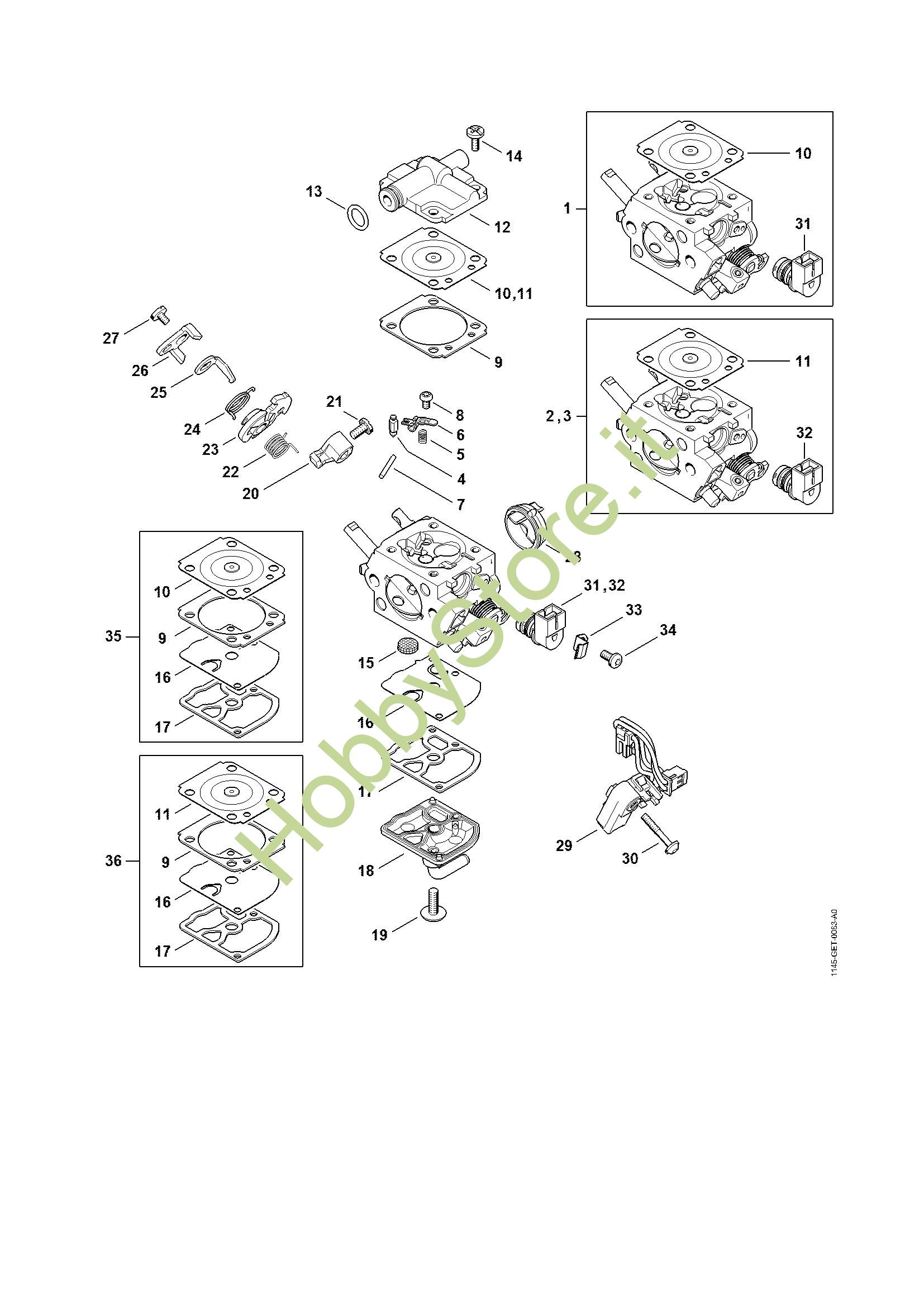 Ricambio Carburatore 1145/27 Motoseghe a benzina (MS) MS 201 TC-M STIHL Contiene anche i ricambi nr. da 4 a 9, 11 a 30, 32 a 34