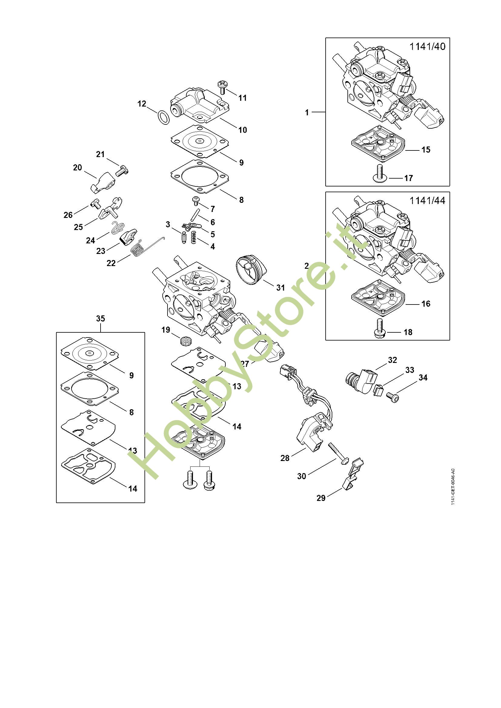 Ricambio Carburatore 1141/40 Motoseghe a benzina (MS) MS 261 C-M VW STIHL Contiene anche i ricambi nr. da 3 a 15, 17, 19 a 34