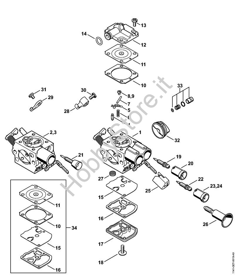 Ricambio Carburatore C1Q-S211B Motoseghe a benzina (MS) MS 261 C-Q STIHL Contiene anche i ricambi nr. da 4 a 8, 10 a 18, 21 a 23, 25 a 27, 29, 31 a 33