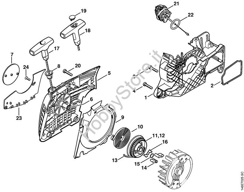 Ricambio Coperchio ventola con dispositivo di avviamento Motoseghe a benzina (MS) MS 270 STIHL Contiene anche i ricambi nr. da 5 a 10, 12 a 16, 18, 19