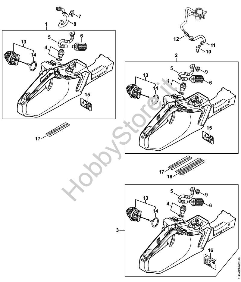 Ricambio Corpo serbatoio Motoseghe a benzina (MS) MS 271 C-BE STIHL Contiene anche i ricambi nr. da 4 a 6, 13 a 15