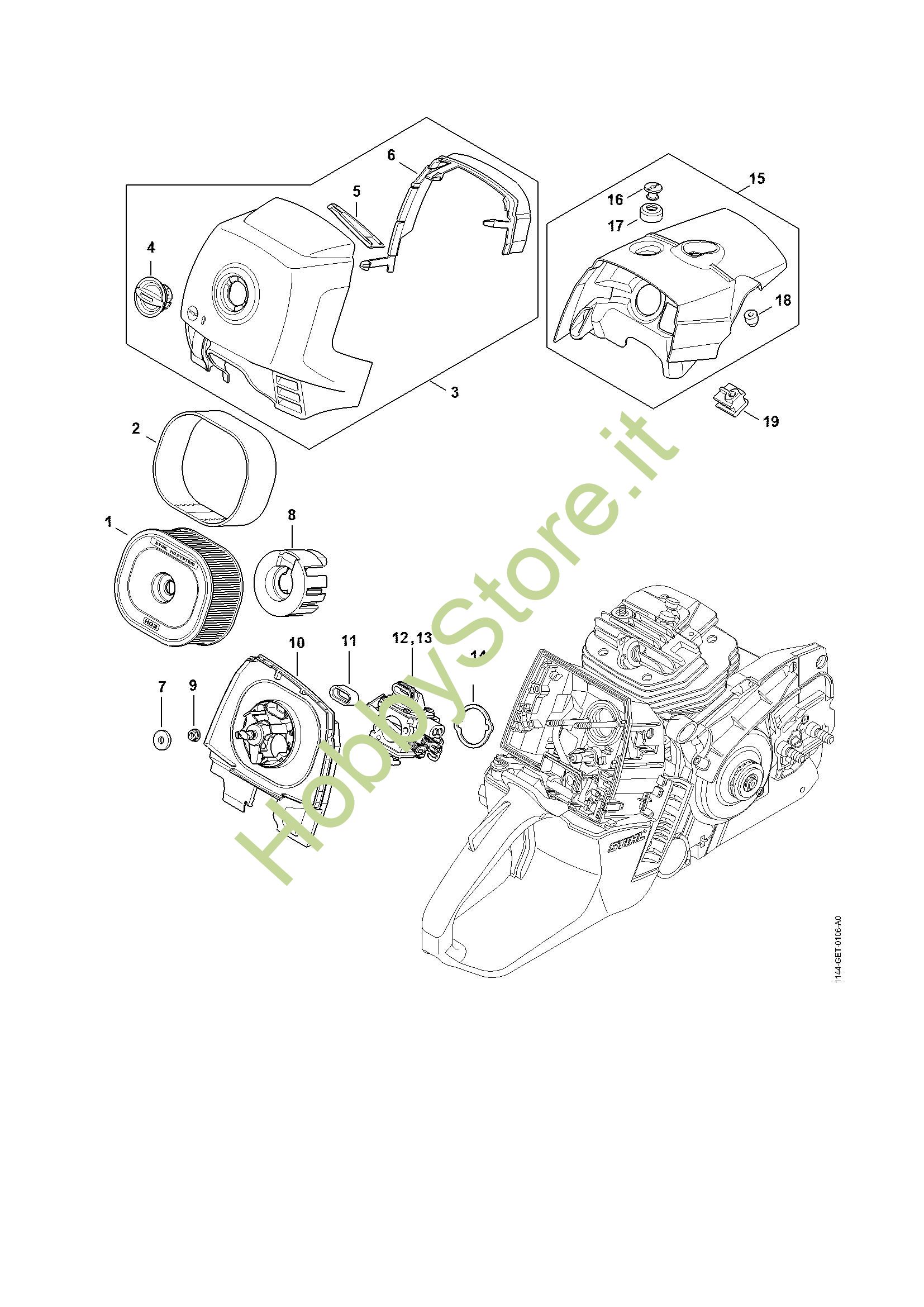 Ricambio Cappottatura Motoseghe a benzina (MS) MS 651 STIHL Contiene anche i ricambi da n. 16 a 18