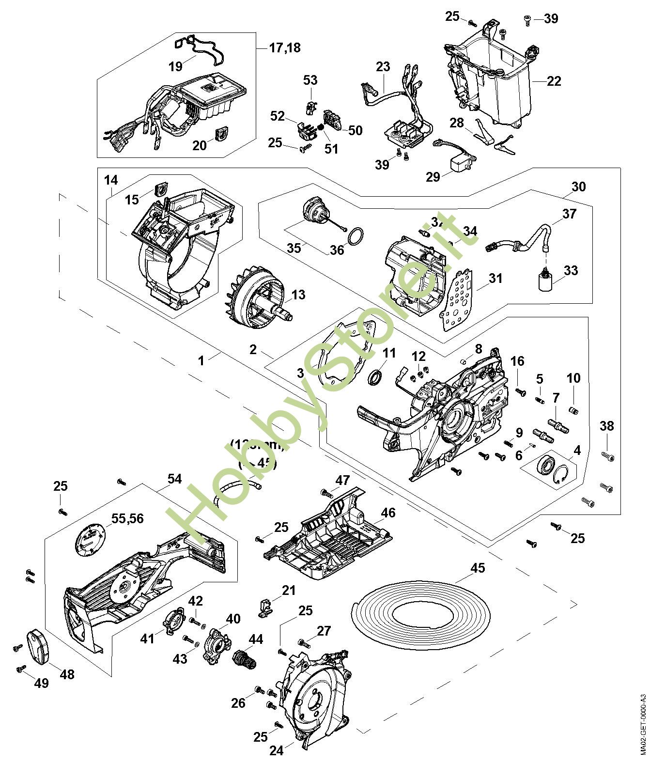 Ricambio Carcassa motore Motoseghe a batteria (MSA) MSA 300.0 STIHL Contiene anche i ricambi n. 55 e 56