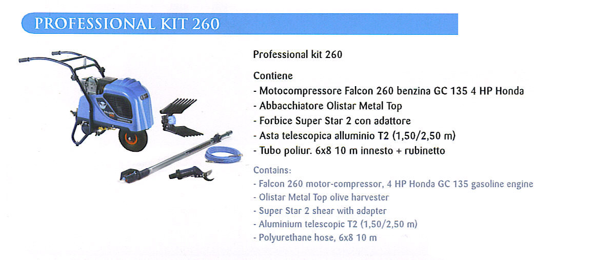 Kit professionale della ditta Campagnola per la raccolta delle olive o della frutta in genere.Kit con motocompressore con traino a cinghia per uso professionale senza limiti di impiego.