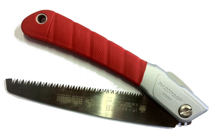 Seghetto per potatura con lama da 200 mm richiudibile. Manico in alluminio, impugnatura in gomma, 2 posizioni di taglio lama a dentatura speciale decrescente con tempera ad impulsi.