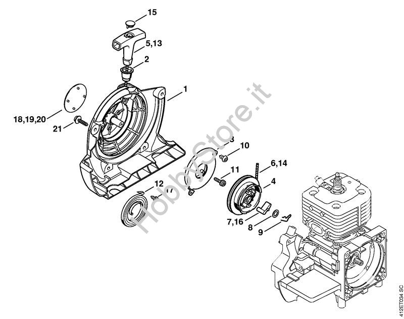 Ricambio Carenatura ventola con dispositivo di avviamento Apparecchi speciali (PC, SP, MC) SP 400 STIHL Contiene anche i ricambi nr. da 1 a 11 e 15